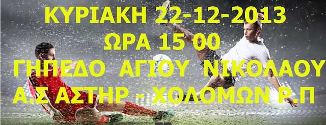 Την Κυριακή 22-12-2013 και ώρα 15 00 στην έδρα μας διεξάγεται ποδοσφαιρικός αγώνας Α.Σ ΑΣΤΗΡ - ΧΟΛΟΜΩΝ Ρ.Π ο αγώνας είναι πολύ σημαντικός για την πορεία της ομάδας , σε περίπτωση νίκης θα παραμείνουμε στην 1η θέση του βαθμολογικού πίνακα ενώ θα αφήσουμε 6 βαθμούς πίσω την ομάδα του ΧΟΛΟΜΩΝ Ρ.Π που βρίσκεται στην 3η θέση. Παρακαλούνται οι φίλαθλοι να ενισχύσουν την προσπάθεια της ομάδας.